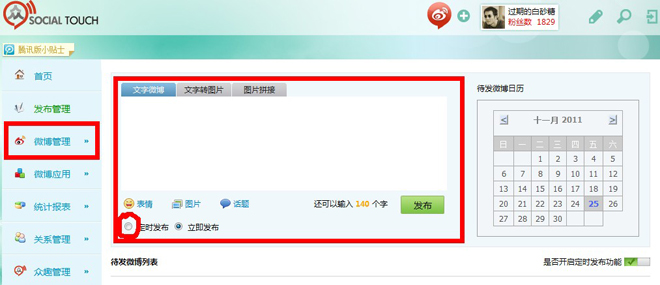 綜合管理,簡單點來說就是前面四部分介紹的功能基本上都有,而且還有管理功能。這兩款綜合應(yīng)用都提供了定時發(fā)布、粉絲分析、傳播分析、多賬號管理等。在“發(fā)布管理”(靠,兩家名字都一樣。)