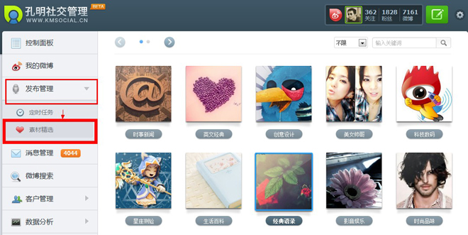 綜合管理這部分,我圖表上列出了孔明社交管理、眾趣免費版和微博大師。因為微博大師收費,而且其官方微博說自己主要也是側(cè)重數(shù)據(jù)分析,而我沒有用過就沒有發(fā)言權(quán),這里就不多說了,剩下的孔明社交和眾趣我對比著給大家介紹。
