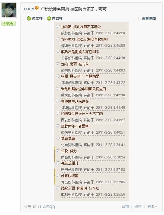一旦占上沙發(fā)就可以獲得意想不到的流量,例如賈學(xué)龍曾經(jīng)占到我博客的沙發(fā),他在留言本中感慨到:哈哈,占了松松哥一篇文章的沙發(fā),昨天來了30多個 IP。有人說,“評論式推廣”成就了盧松松,也有人說,是盧松松造就了評論式推廣,無論誰造了誰,一旦成功結(jié)果被大家熟知,就會被越做越爛。這種爛的方式 還會繼續(xù)下去,在2012年……