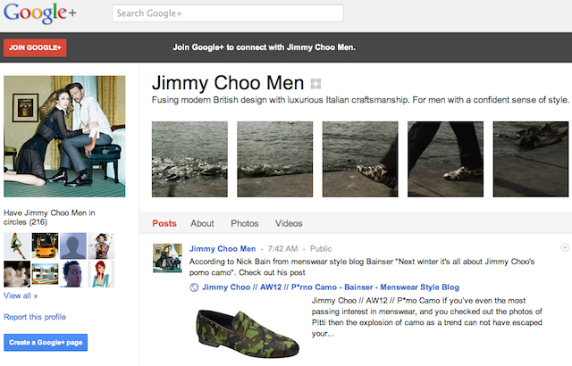 最近,Jimmy Choo 把注意力投向了Google+。去年11月發(fā)布的Google品牌頁(yè)面和Jimmy Choo在倫敦伯靈頓商場(chǎng)開設(shè)的第一間男裝店相輔相成。