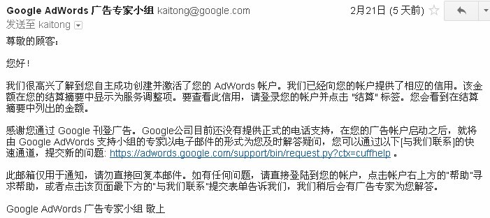 網(wǎng)上無意發(fā)現(xiàn)最近谷歌在做活動,開戶就送350元Google Adwords的費用。雖說350元廣告費發(fā)揮不了太大作用,但抱著試一試的心態(tài)開通了申請了活動,填寫了電話、姓名、郵箱及打算推廣的網(wǎng)站。然后等回音。大約過了四天,谷歌一位MM打電話來,說申請已通過,郵箱里也收到了開通郵件(如圖)。電話里耳朵對耳朵地教我操作,老實說adwords的用戶體驗做得不太好,不太符合中國人的操作習慣,我試了好幾遍才成功設置了一個廣告系列,而且廣告系列有幾個沒能通過審核,提示有侵權內(nèi)容。
