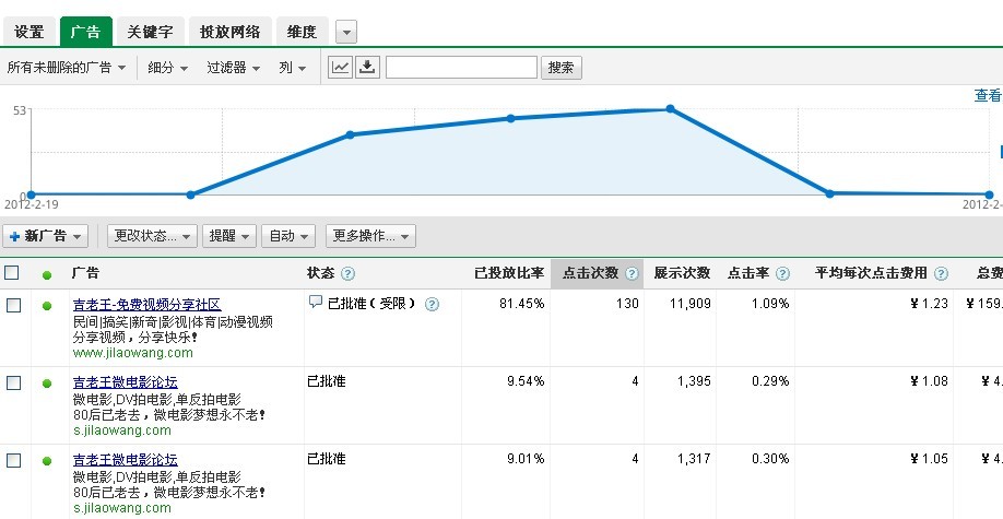 廣告語不要設置得太夸張,比如中國最大微電影社區(qū)吉老王微電影論壇http://s.jilaowang.com/,最搞笑最好看的視頻網(wǎng)站吉老王等形容詞。谷歌adwords不歡迎這類浮夸的廣告語。