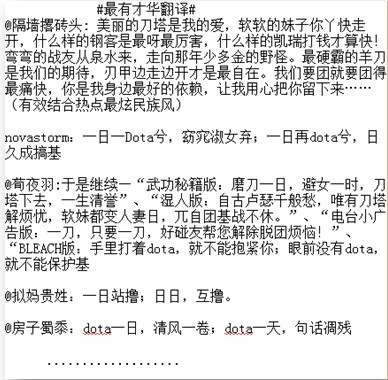 當(dāng)我看到這個圖的時候腦子里閃過的第一印象是:內(nèi)涵。這個詞在杜蕾斯的標(biāo)簽中是第一位的。所有看到的人都可以天馬行空,根據(jù)自己的想法來翻譯,你可以把這句話交給百度,也可以根據(jù)自己理解來翻譯,各種有才華的翻譯開始井噴,并且引申出來了二次話題#三種青年的翻譯#、#最炫民族風(fēng)的翻譯#、#離騷體#、等一系列網(wǎng)性極強(qiáng)的翻譯,讓人贊不絕口