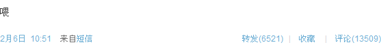 出于對(duì)此網(wǎng)站網(wǎng)營(yíng)手段的欣賞,我保留了圖片上的網(wǎng)址。新浪微博可以稱得上是國(guó)內(nèi)最火的微博,名人眾多,我也非常樂(lè)于在上面溜達(dá)(AD一下,我的微博名為“那年那事那人”),但也存在一個(gè)怪圈,名人放個(gè)屁都能得到一片響應(yīng),普通的草根絞盡腦汁發(fā)出的經(jīng)典話語(yǔ)卻無(wú)人問(wèn)津,韓寒僅僅在新浪微博上說(shuō)了一個(gè)“喂”,便得到了13509條評(píng)論以及6521次轉(zhuǎn)發(fā),如圖: