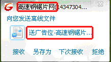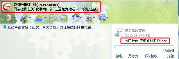 我之前寫過一篇帖子:“個(gè)人做產(chǎn)品網(wǎng)絡(luò)銷售經(jīng)驗(yàn)分享 ”,我們小商鋪是賣鋸片的,我曾到“高速鋼鋸片網(wǎng)”免費(fèi) 發(fā)布過我們 的產(chǎn)品信息,在那里就留了QQ號(hào)碼,后來,她們就使用了QQ的“發(fā)送離線文檔功能”發(fā)一些優(yōu)惠活動(dòng)的文檔資料給我。注意看上面兩圖中紅色框標(biāo)注的地 方:QQ呢稱、QQ簽名、文檔名的寫法,這個(gè)例子就能很好的說明細(xì)節(jié)的重要性。這些地方的文字使用恰當(dāng)了,對(duì)方很少會(huì)拒絕接收你發(fā)送的文檔。