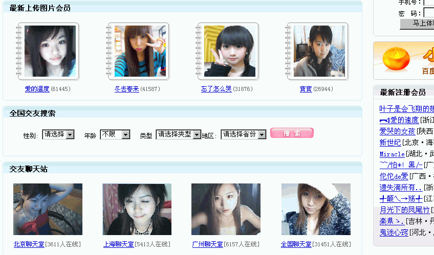 百度從來沒有公開宣傳過“百度交友”,甚至登錄百度首頁(yè),你都找不到“交友”的鏈接地址。記者在百度總部采訪了解到,百度即將推出的產(chǎn)品包含交友中心以及聊天室。隨后記者登陸交友中心網(wǎng)頁(yè)看到,已經(jīng)有不少人得知了百度交友測(cè)試版的地址,并已注冊(cè)了不少的用戶。