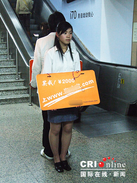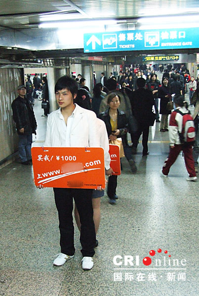 國際在線4月5日消息(駐上海記者 肖志濤):“買我!2000元” 昨日,上海徐家匯處地鐵站里上演一出容易讓人誤解的廣告推廣活動。兩對年紀(jì)不過20多歲的年輕男女懷捧著一塊引人注目的告示牌,男孩標(biāo)價"1000",女孩標(biāo)價"2000"。乍一看還誤以為是活人拍賣,走近一看,原來是某網(wǎng)站的推廣活動,這樣"別出心裁"的促銷推廣活動讓人啼笑皆非。