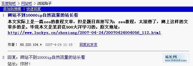 2、你要站在瀏覽者的角度去加標(biāo)題。大家知道內(nèi)容的標(biāo)題一般是吸引用戶的關(guān)鍵,如果你的標(biāo)題不適當(dāng),那么再好的文章,也難以引起別人的注意。我簡(jiǎn)單說(shuō)下我給文章怎么取標(biāo)題。暶鳎嚎赡芤婕暗浇o我網(wǎng)站AD,不過(guò),我把經(jīng)驗(yàn)和秘訣都傳受給你了,你還不給我?guī)讉(gè)IP)我昨天看到一篇很有價(jià)值的SEO教程。我決定把他推廣到百度貼吧里面。但是把標(biāo)題寫(xiě)成SEO教程就有點(diǎn)浪費(fèi)了,因?yàn)榫W(wǎng)上這一類文章標(biāo)題很多。有的把不是SEO的內(nèi)容也寫(xiě)上了,嚴(yán)重影響到SEO教程的形象。我改變了下標(biāo)題,是因?yàn)閾?jù)說(shuō)曾經(jīng)有人用這個(gè)教程推廣達(dá)到日10000IP的流量,所以我直接取標(biāo)題:網(wǎng)站不到日10000IP自然流量的站長(zhǎng)看!標(biāo)題和內(nèi)容都好了,接下來(lái)就是推廣了,推廣要找到合適的推廣地方。比如,你把教程推廣到游戲里面,效果當(dāng)然很差了。我根據(jù)標(biāo)題的范圍和內(nèi)容把他推廣到網(wǎng)站吧和流量吧里面,收到不錯(cuò)的效果!但是要注意:貼吧最終目標(biāo)還是給別人看或者解決問(wèn)題的,你不能取個(gè)好標(biāo)題卻是為了把瀏覽者吸引到你的網(wǎng)站去,一定要能把標(biāo)題吸引用戶到你的網(wǎng)站上面去,而且也能適當(dāng)?shù)慕鉀Q人家的問(wèn)題,免得糟蹋了一個(gè)好的題目。說(shuō)不定一不小心惹惱了用戶,把你的站舉報(bào)……