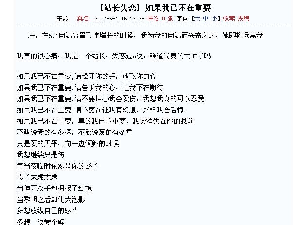 看!他把站長的失戀都寫出來了!呵呵。需要注意的是:你要大概估計(jì)下你的軟文有多少人瀏覽!當(dāng)然,這些除了內(nèi)容和標(biāo)題,還有其他因素,如:你把你的軟文發(fā)表在什么地方,人氣大的站長論壇(im286.com)還是站長行業(yè)站上(admin5.com或chinaz.com)、你的軟文標(biāo)題是否加粗加紅(加粗加紅的標(biāo)題有利于搜索引擎的收錄和吸引站長的注意力)、你是否考慮到將有哪些水平不同的站長會(huì)瀏覽你發(fā)表的媒體網(wǎng)站(假設(shè)你在admin5.com發(fā)表的是提高站長php編程技巧文章,那對(duì)于asp為主站長來說基本上沒有多大用處)。