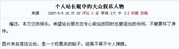 他實(shí)際上是一個(gè)站長對(duì)im286.com網(wǎng)站上投票結(jié)果的新鮮而贊同,可是開頭卻寫的是為了讓站長休閑下,似乎很響影圖王老大提出的站長注意休息的口號(hào)!