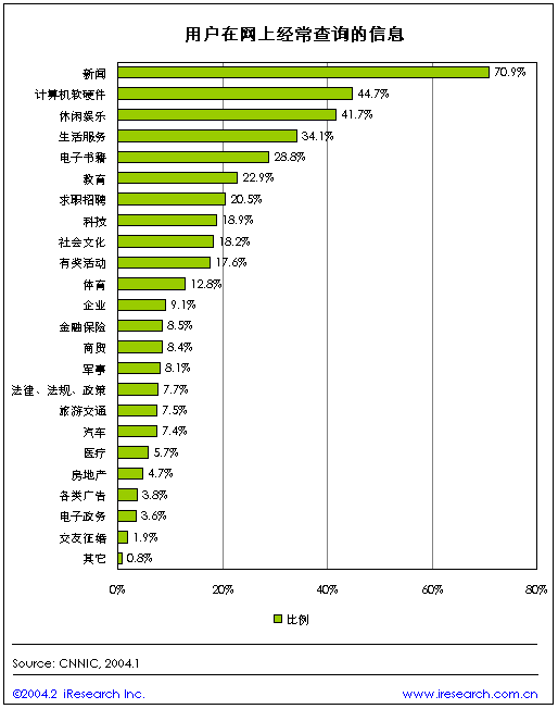經(jīng)調(diào)查:用戶在網(wǎng)上經(jīng)常查詢的信息! 用戶在網(wǎng)上經(jīng)常查詢的信息中,新聞信息是占比例第一位的,為70.9%,其次是計(jì)算機(jī)軟硬件信息,為44.7%;第三位的是查詢休閑娛樂信息,為41.7%。 所以,sina等大型的門戶,小熊在線等一系列的硬件信息,QQ等一些休閑網(wǎng)站備受關(guān)注!