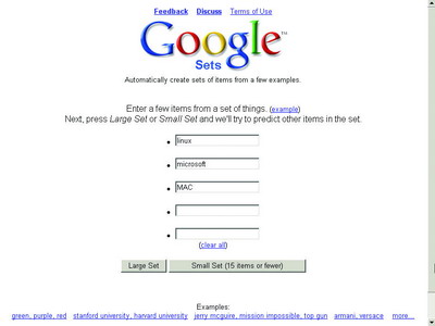 如圖11所示,相關(guān)搜索其實是幫助你將相同的搜索關(guān)鍵詞歸為一類,然后將擴充的內(nèi)容反饋給你參考的一種功能,極其智能化。例如,假設(shè)你在搜索信息框中依次輸入Microsoft、Linux、Mac(都是操作系統(tǒng))這幾個關(guān)鍵詞,然后選擇點擊下面的Large Set按鈕(顯示更多內(nèi)容)或者Small Set按鈕(只顯示15條或者更少的相關(guān)內(nèi)容)。搜索結(jié)果出現(xiàn)了,全部是操作系統(tǒng),包括Sun Solaris 、SCO UNIX 、IBM AIX和Novell等,便于比較。